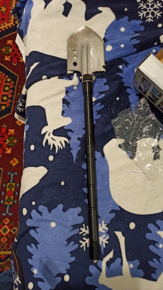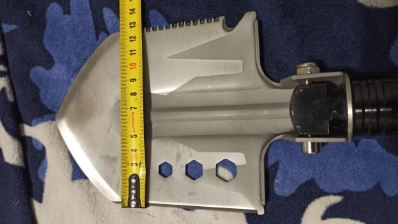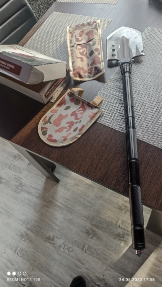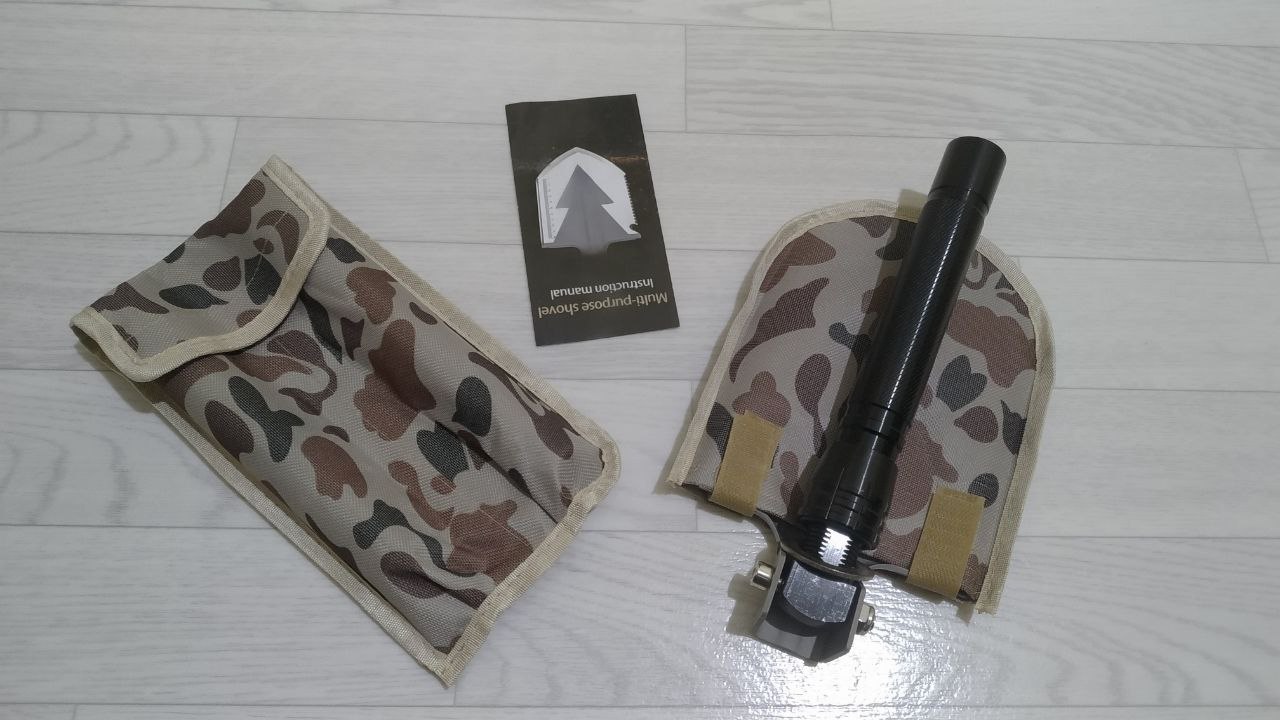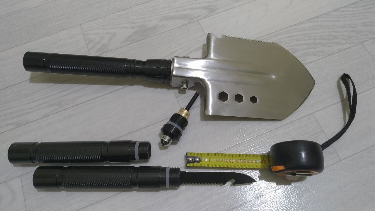 I am very pleased with the purchase. In disassembled and folded form, the shovel is placed in a box less than A4 sheet. There's a shovel, a saw, an ax, a knife, a hammer. And besides them, fire, opener, screwdriver-hexagon. The shovel itself is about 75 cm, of which 60 cm is ancient. Leg-9 cm. The shovel is comfortable, pleasant tactile and pleasant in weight. In the kit it is attached a couple of cases and a technique with options for the use of the device.